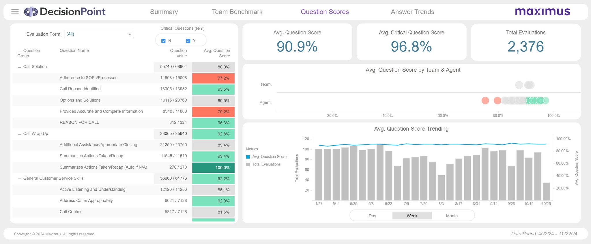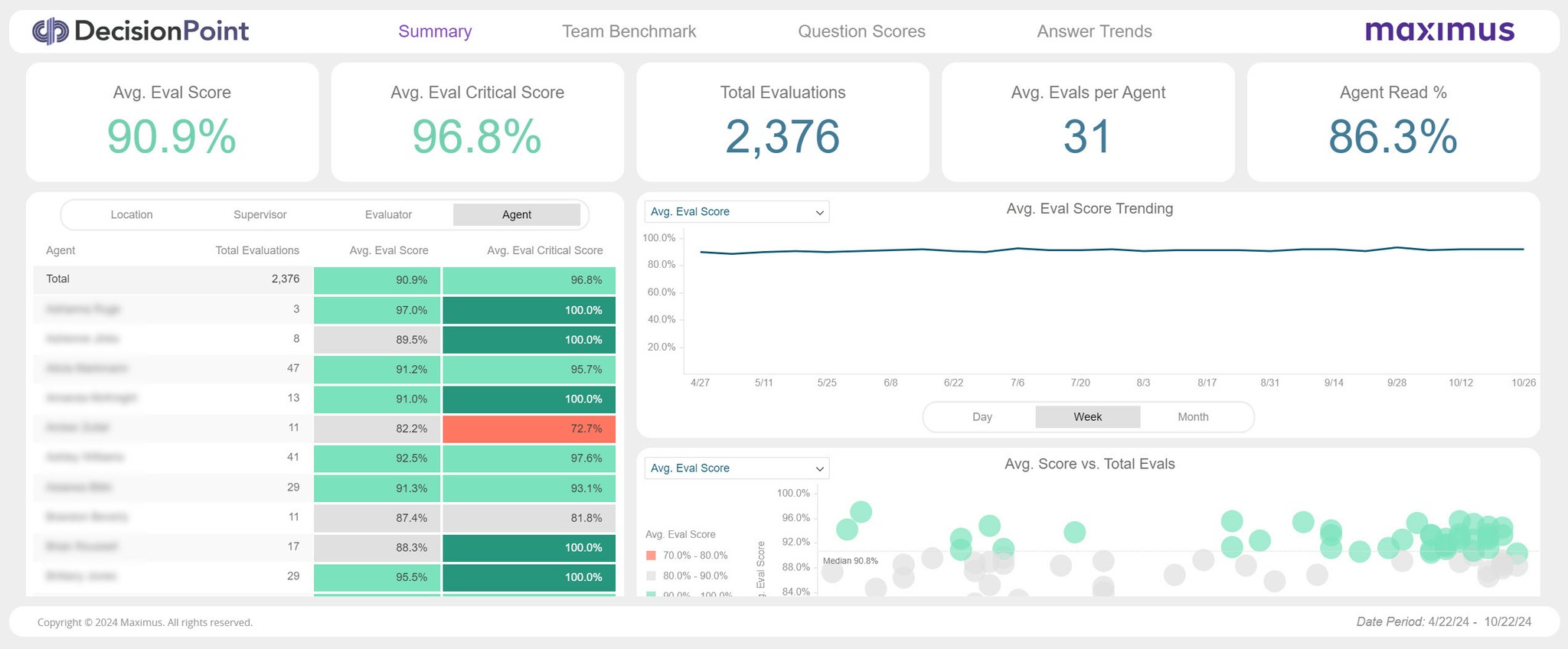 • This dossier provides insights into Agent Evaluations data (ex. Count of Evaluation score, Avg Evaluation Score, Avg. Critical Question Score) by Day, Week, Month, Quarter, Year.