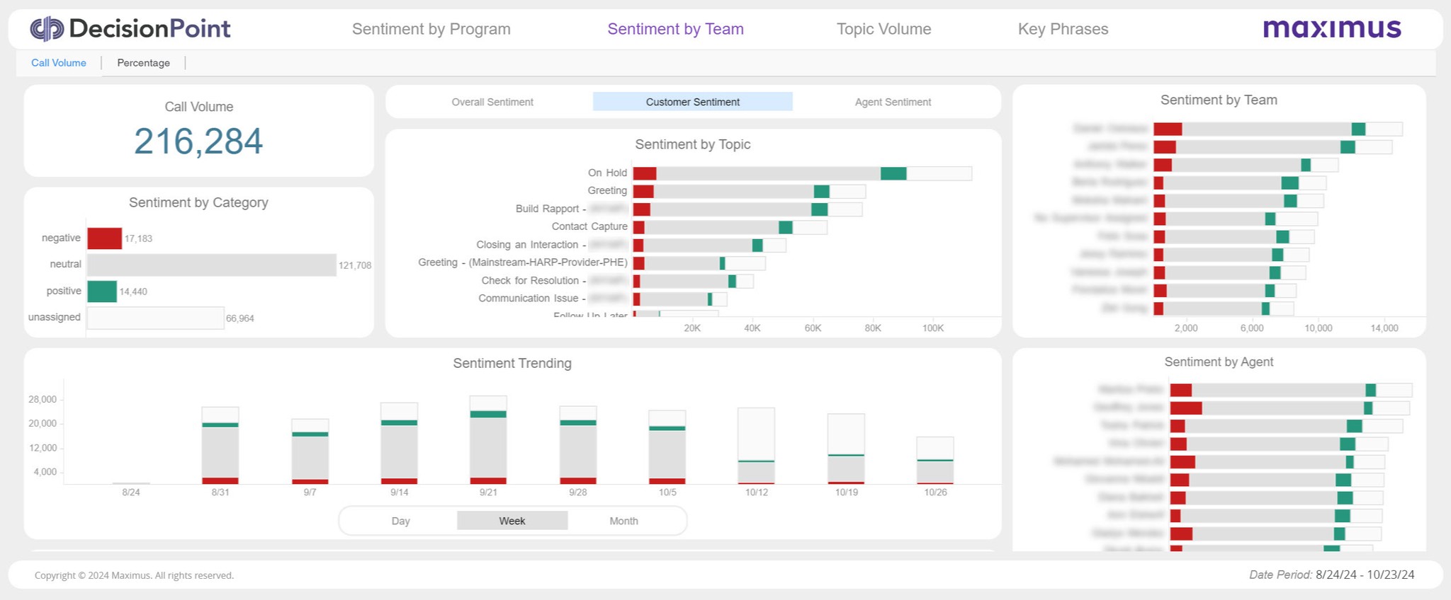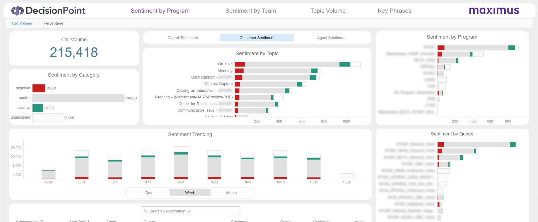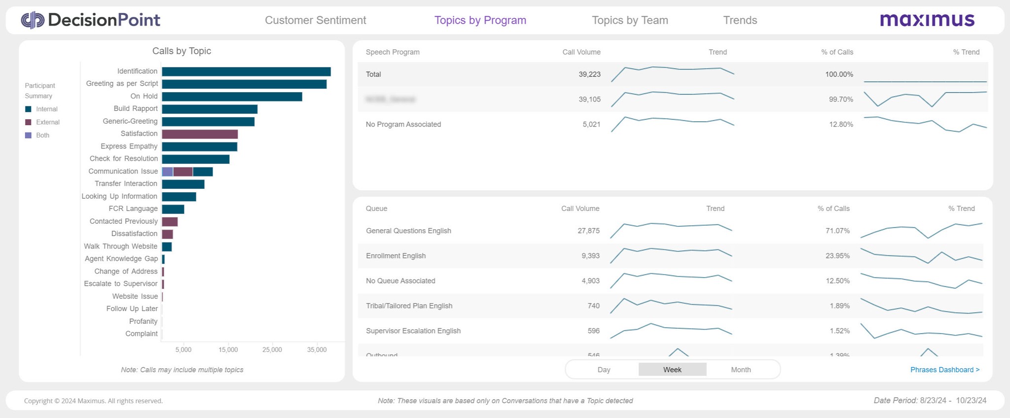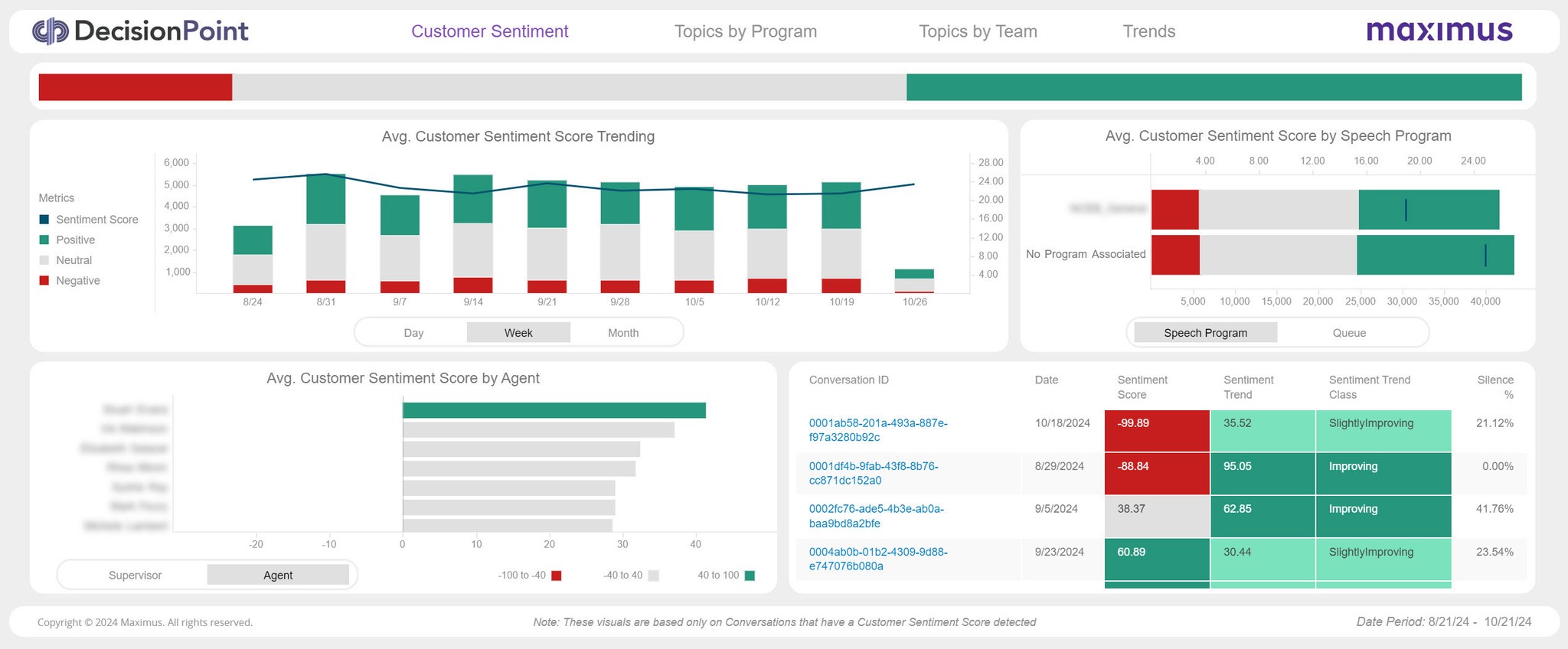 •This dashboard utilizes an in-house machine learning model based on Genesys Transcript to offer insights into sentiment and the topics discussed during conversations. Data is available at the program, queue, supervisor, agent, and session levels.