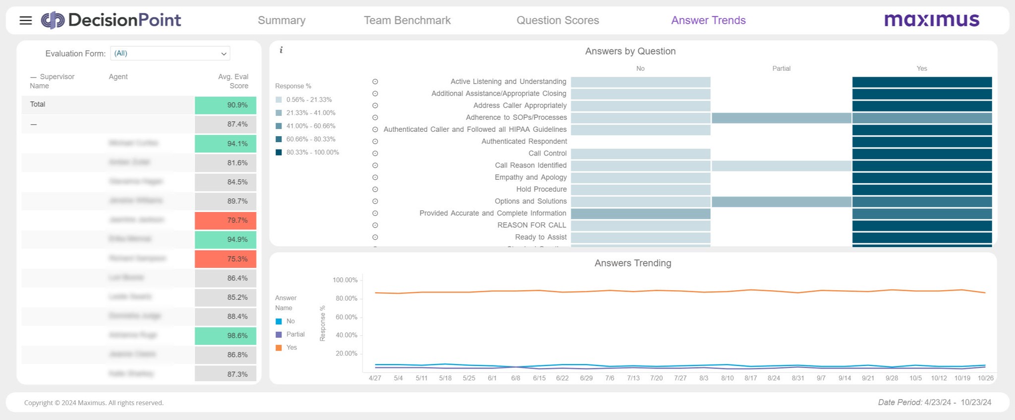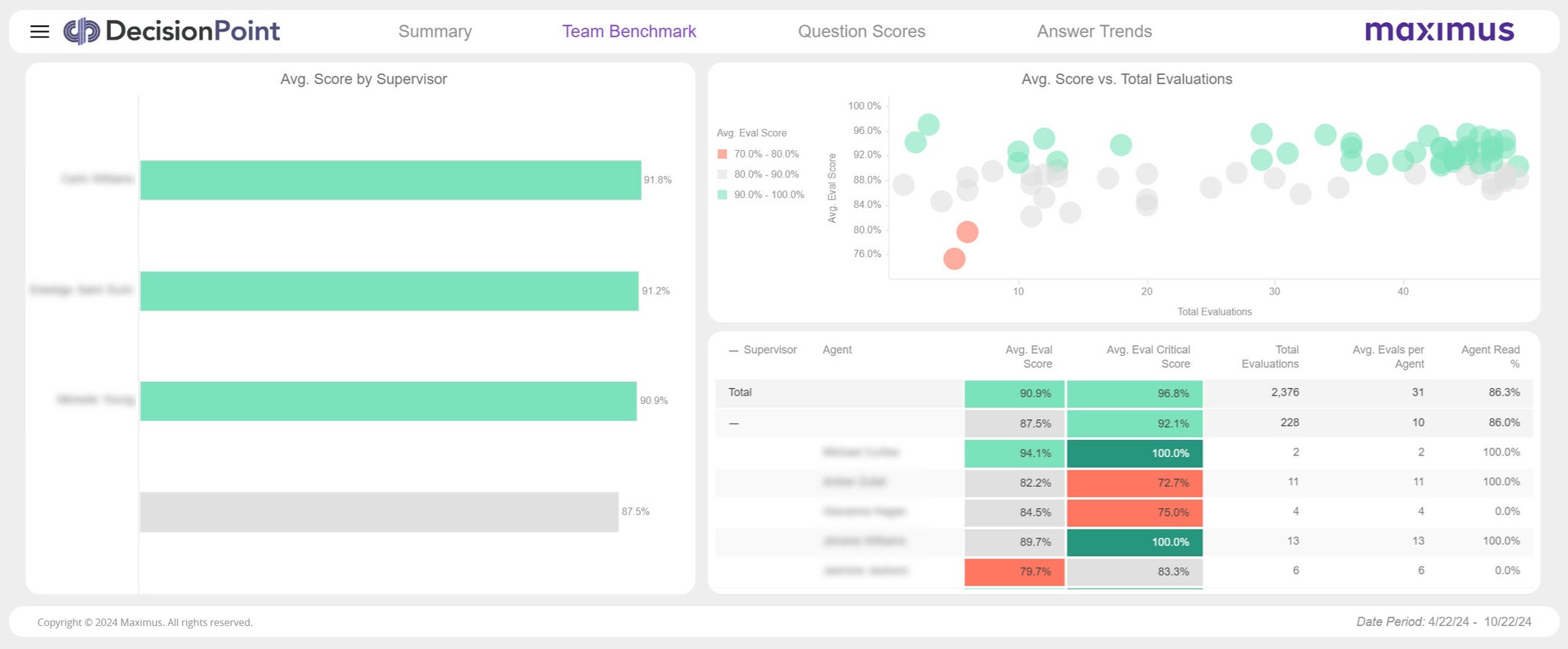 • This dashboard allows to easily compare performance across teams and quickly drill down to view an individual agent’s scorecard so that the manager can understand how teams/agents are performing compared to one another and when necessary take action.