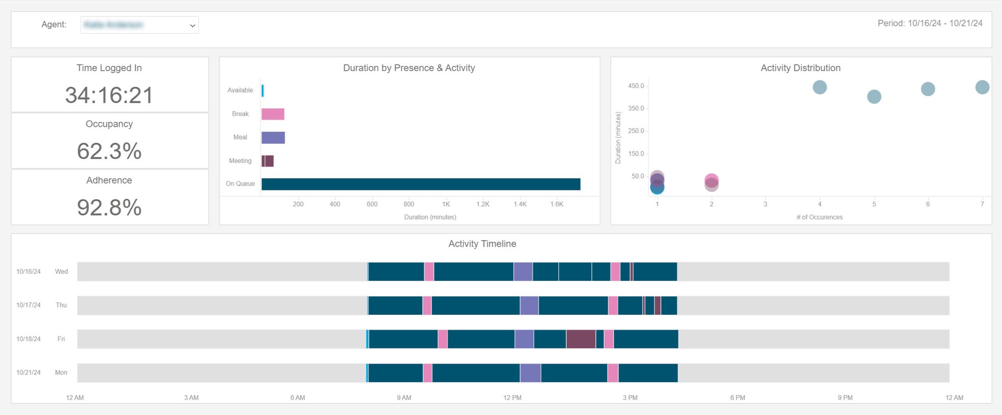 • This dashboard provides the ability to analyze agent login and logout activity by type (reason code). Activity can be analyzed at a summary level as well as details for an agent by date.