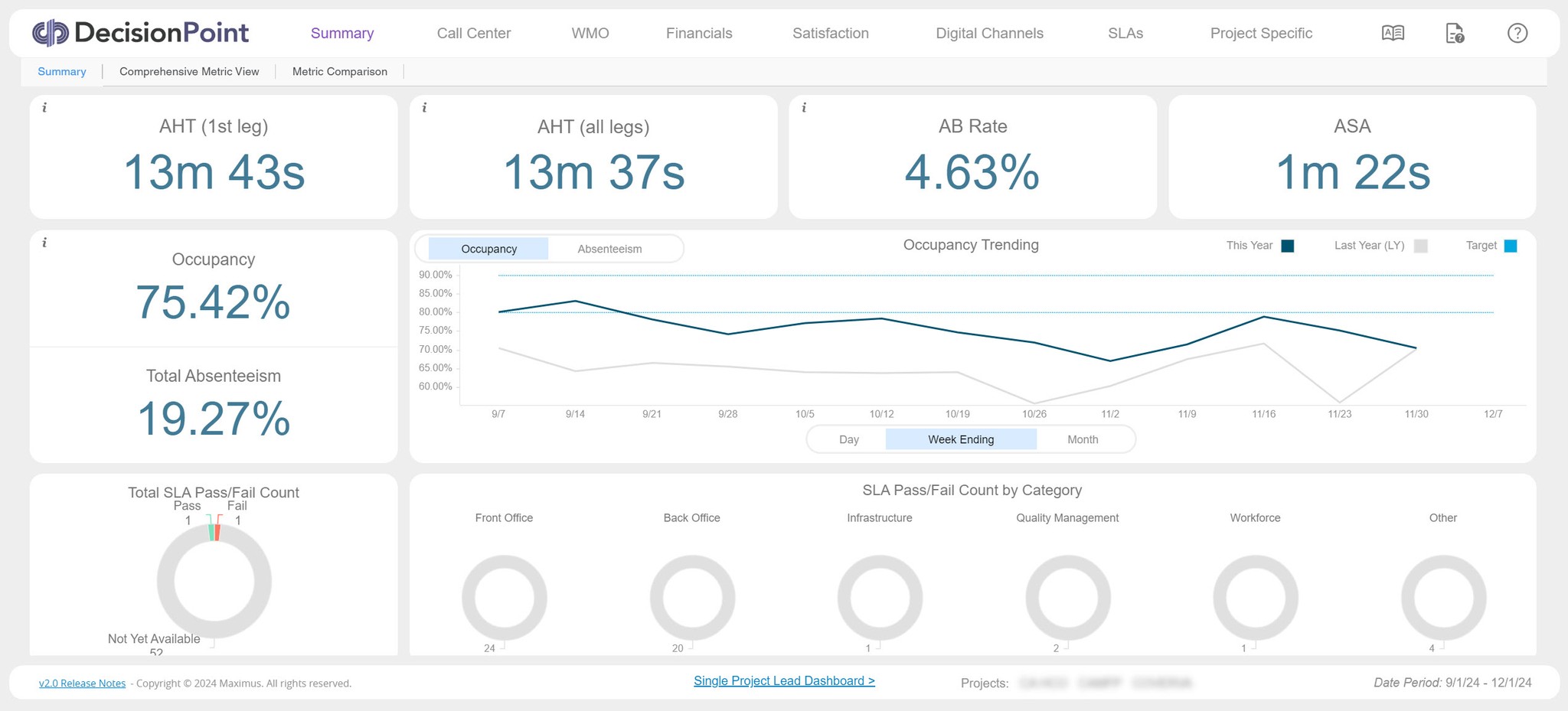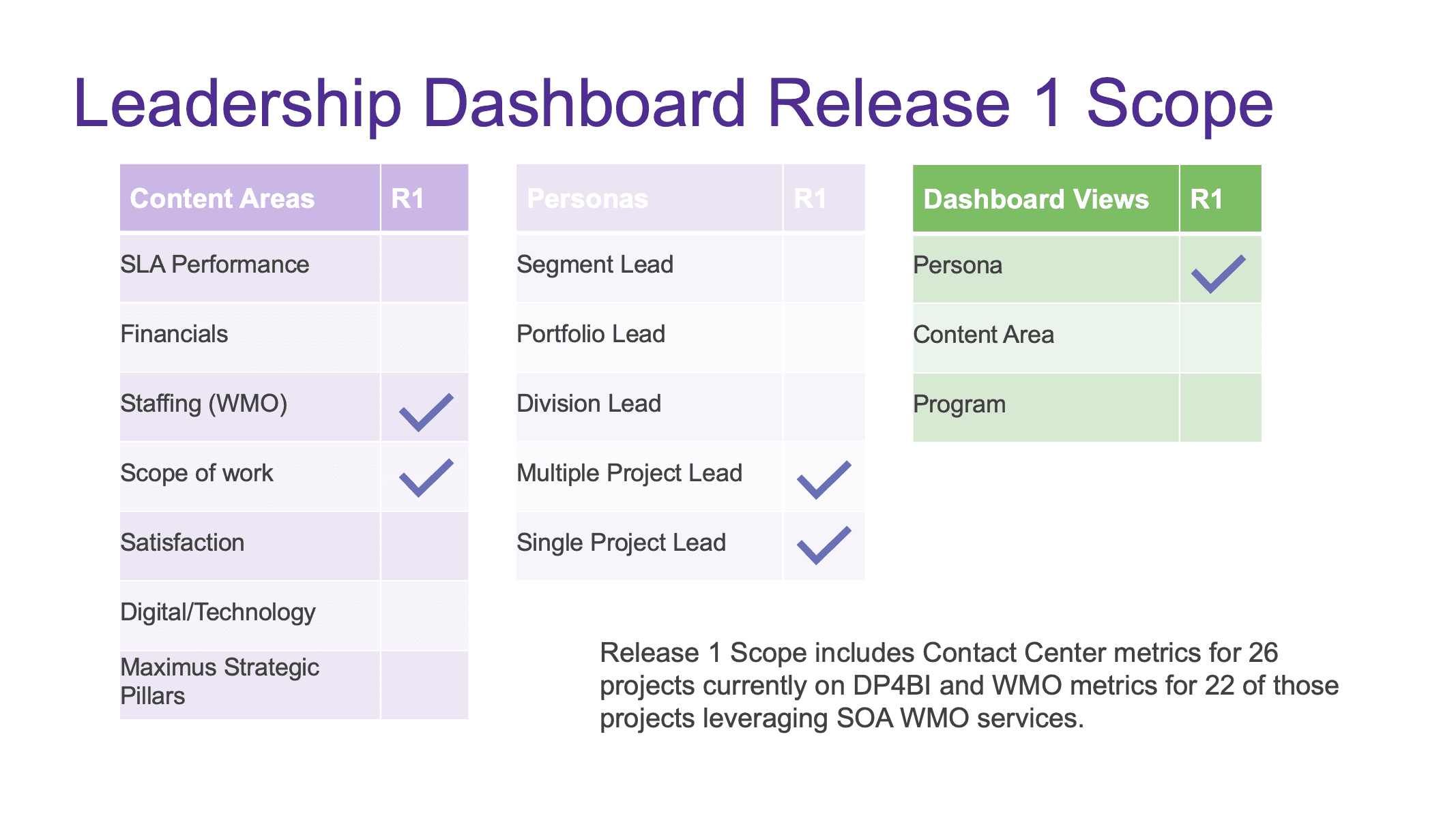 The two content areas we had designated for the first release (Call Center and Staffing) contained many KPIs familiar to myself and my team. The primary need was to see how these metrics are performing within a given time window at a Project level.