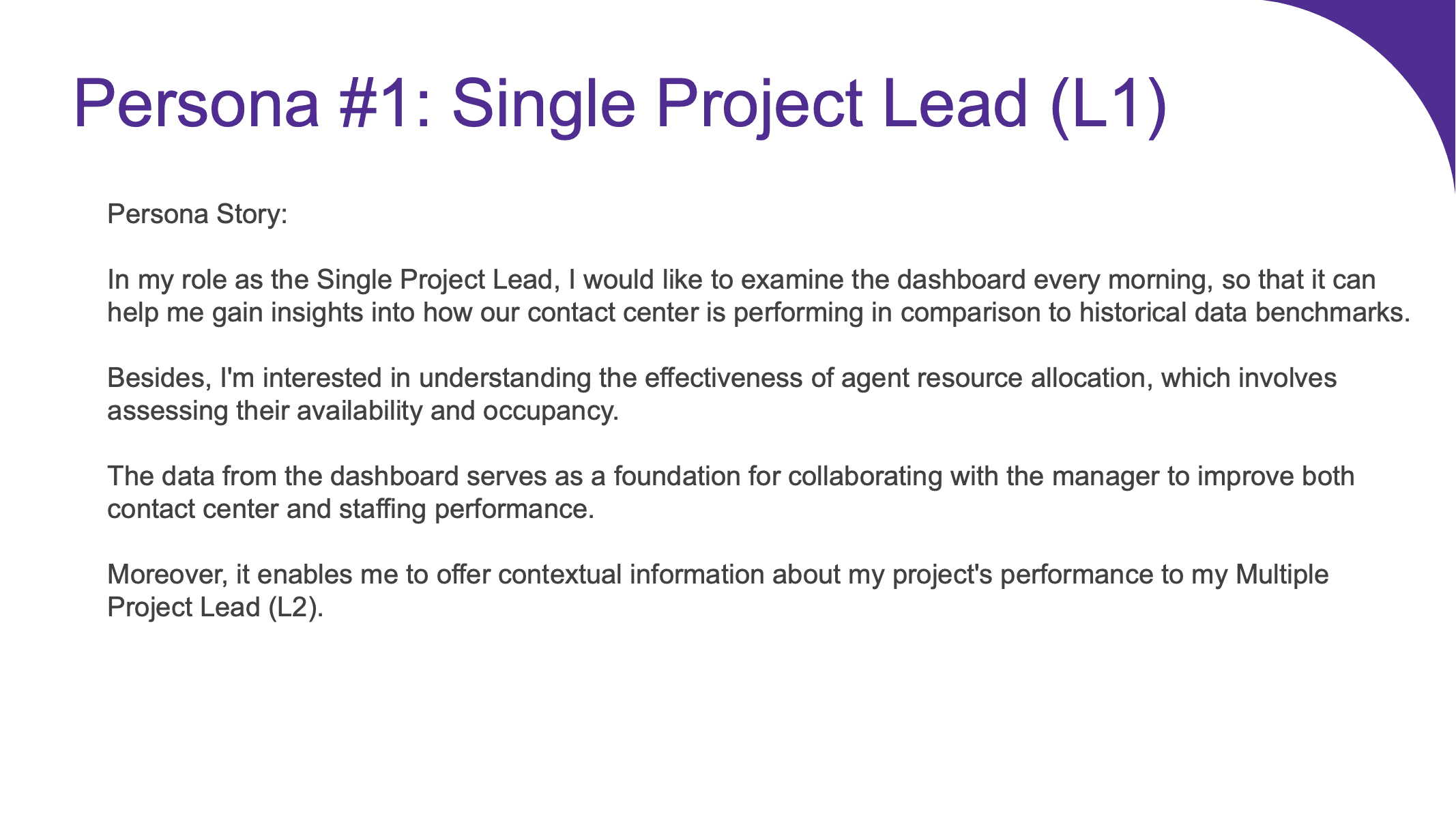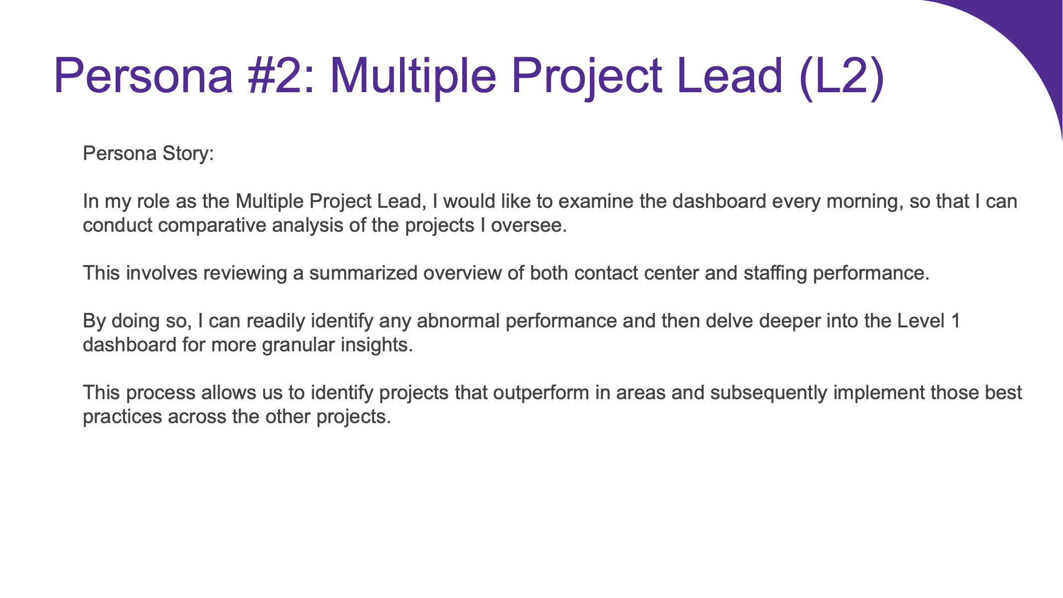 Single Project Lead: The highest person in charge of a single project. They require an operational view, only looking at a single project at a high level. They need daily but not hourly level performance insights.